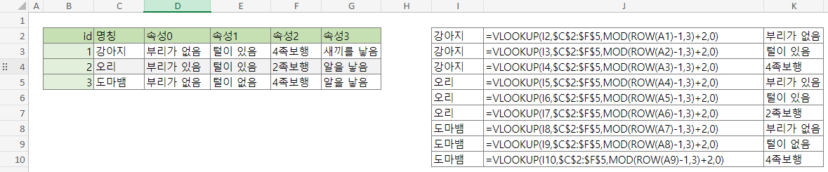 '예시 2'의 세 번째 열은 좀 까다로워 보인다. 그러나 지금까지 나온 것들을 잘 조합해 활용하면 해결할 수 있다. 아래 방법에서 사용한 핵심 아이디어는 위에서 =VLOOKUP(a,b,c,[t]) 으로 찾았던 반복 텍스트를 그대로 활용하고, c 값에도 변동을 주기 위해 =MOD(a,b)를 사용해 반복 숫자 패턴을 만들었다는 점이다.