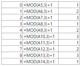 그렇다면 (1, 2, 3, 1, 2, 3, 1, 2, 3) 과 같은 패턴은 어떻게 만들 수 있을까? 이 경우에는 나머지를 활용할 수 있다. (0, 1, 2, 3, 4, 5, 6, 7, 8, 9) 를 각각 3으로 나눈 나머지는 (0, 1, 2, 0, 1, 2, 0, 1, 2, 0) 으로, 위에서와 마찬가지로 각 요소에 1을 더해주면 우리가 원하는 (1, 2, 3, 1, 2, 3, 1, 2, 3, 1) 을 만들 수 있게 된다. 이는 엑셀에서 =MOD(a,b) 를 사용하면 된다. QUOTIENT에서와 마찬가지로 a를 b로 나눈 나머지를 출력해 준다.