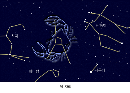 게자리는 쌍둥이자리와 사자자리 사이에서 볼 수 있어요.
