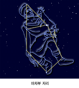 마차부자리는 북두칠성에서 국자 그릇 방향으로 쭉 가다 보면 보이는 오각형의 별자리예요.