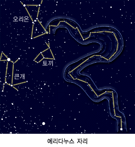 에리다누스자리는 긴 뱀 형태 혹은 큰 강 형태로 구성되어 있어서 비교적 눈에 띄기 쉬운 편이에요.