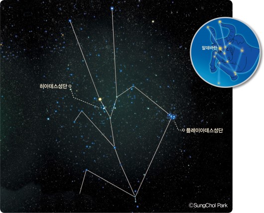 황소자리의 V자 형태에 가장 밝은 별은 알데바란으로, 알데바란 근처에는 히아데스라는 이름의 성단(수십에서 수백 개 별들의 집단)이 있고, 황소 어깨에는 플레이아데스라는 이름의 성단이 있어요. (우리나라에서는 플레이아데스성단을 좀생이별이라고 불러요.)