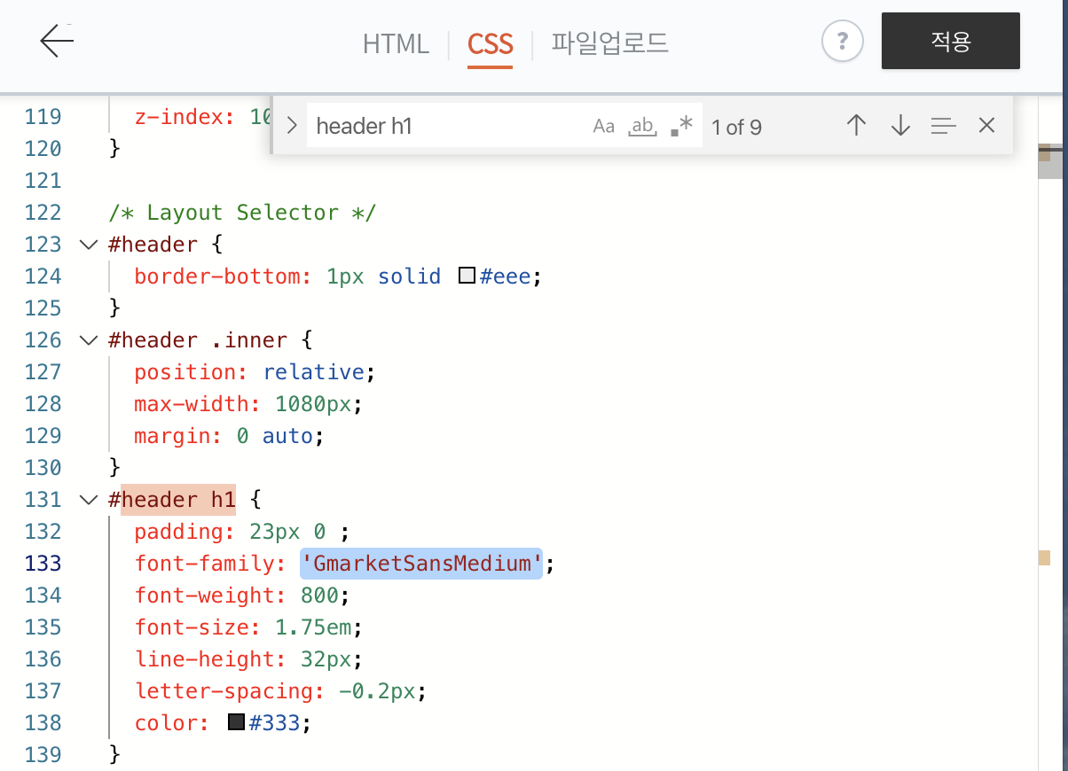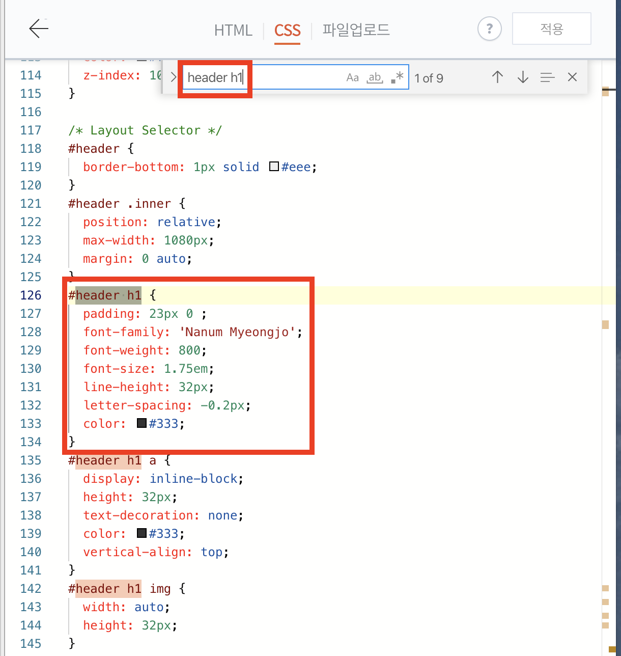 2) <CSS> 화면에서 ctrl+f로 'header h1'을 찾기